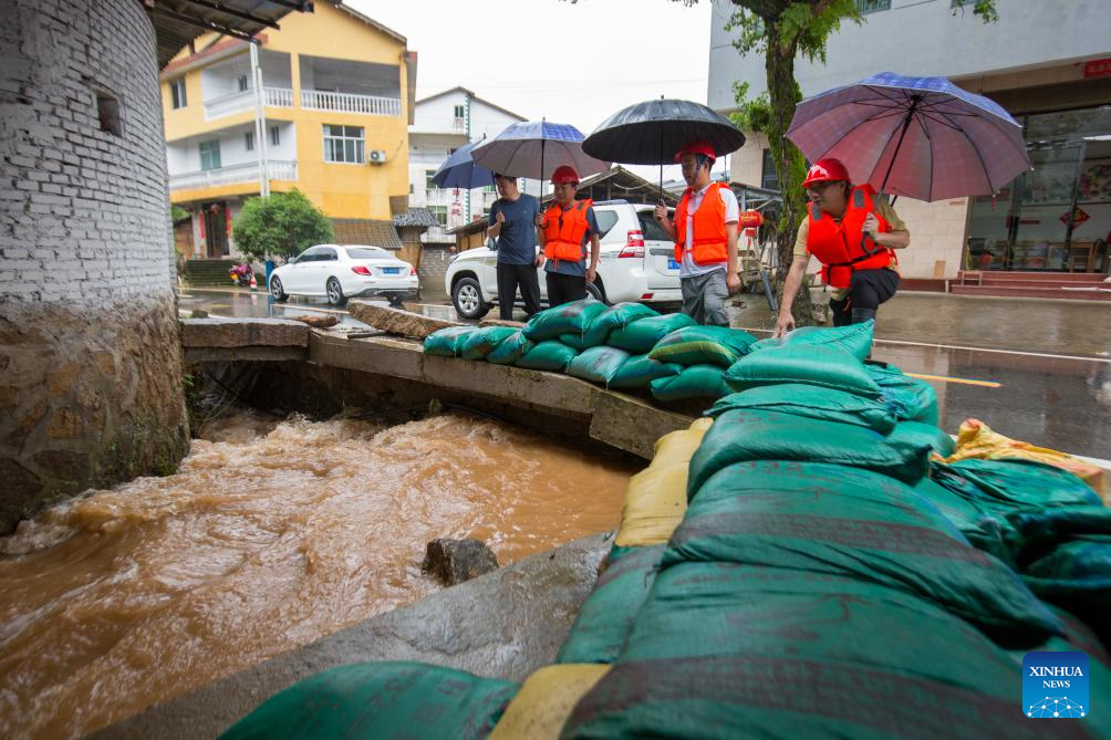 Rescuers inspect the flood at a drainage channel in Hongxing Village of Xingcun Township of Wuyishan, Nanping City, southeast China's Fujian Province, June 16, 2024.(Photo by Chen Ying/Xinhua)