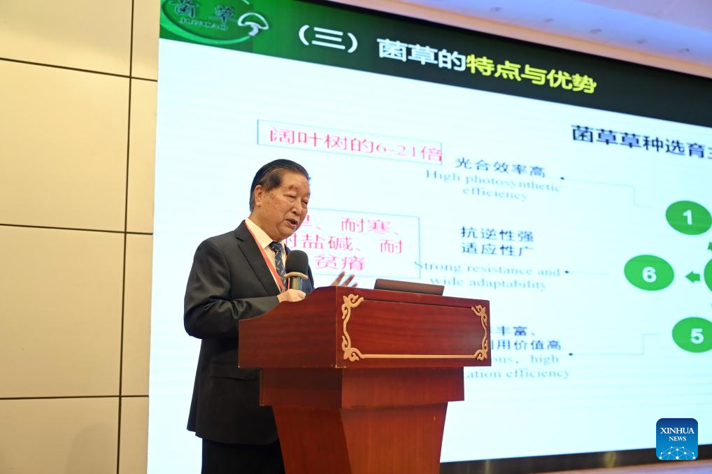 Lin Zhanxi, the inventor of Juncao technology, speaks during a seminar on development of Juncao industry in Fuzhou, southeast China's Fujian Province, June 16, 2024. Representatives from 19 countries and regions including Rwanda, Papua New Guinea, and Fiji, as well as more than 200 Chinese experts, scholars, and business representatives attended the meeting.