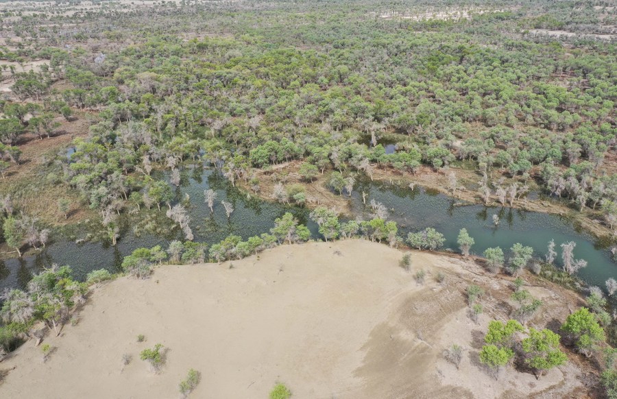 This aerial photo taken on May 25, 2023 shows a view of the desert poplar (populus euphratica) forest on the edge of Taklimakan desert, northwest China's Xinjiang Uygur Autonomous Region. (Xinhua/Hu Huhu)