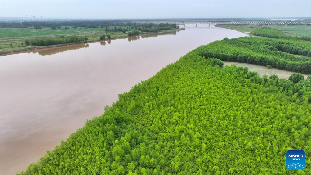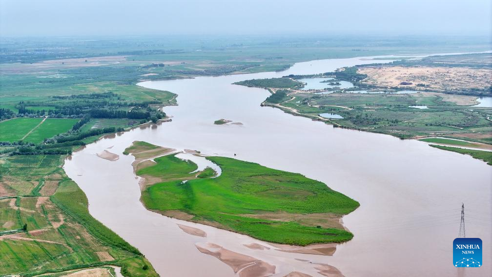 An aerial drone photo taken on June 13, 2024 shows a section of the Yellow River in northwest China's Ningxia Hui Autonomous Region. The Yellow River, China's second-largest river after the Yangtze, is dubbed the "mother river." In recent years, continued efforts have been made to protect its ecology, as vitality has returned to the Yellow River basin in Ningxia. (Xinhua/Wang Peng)
