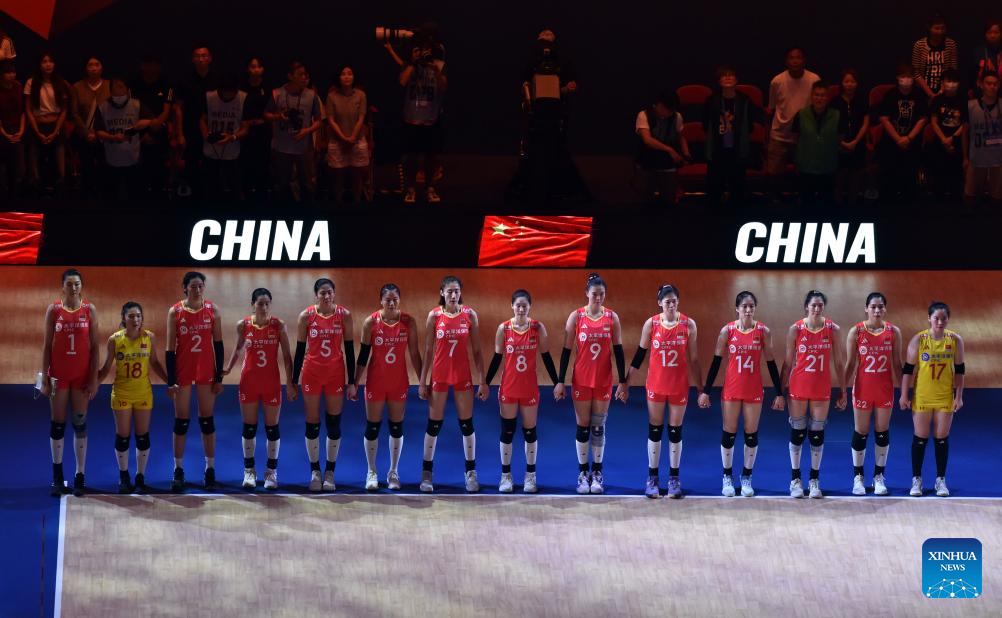 Players of China line up before the preliminary match between China and Trkiye at the Women's Volleyball Nations League 2024 Hong Kong in Hong Kong, south China, June 15, 2024. (Xinhua/Lo Ping Fai)