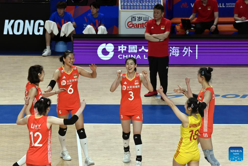 Players of China celebrate scoring during the preliminary match between China and Trkiye at the Women's Volleyball Nations League 2024 Hong Kong in Hong Kong, south China, June 15, 2024. (Xinhua/Lo Ping Fai)
