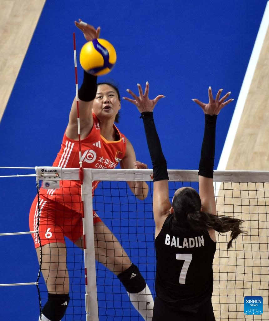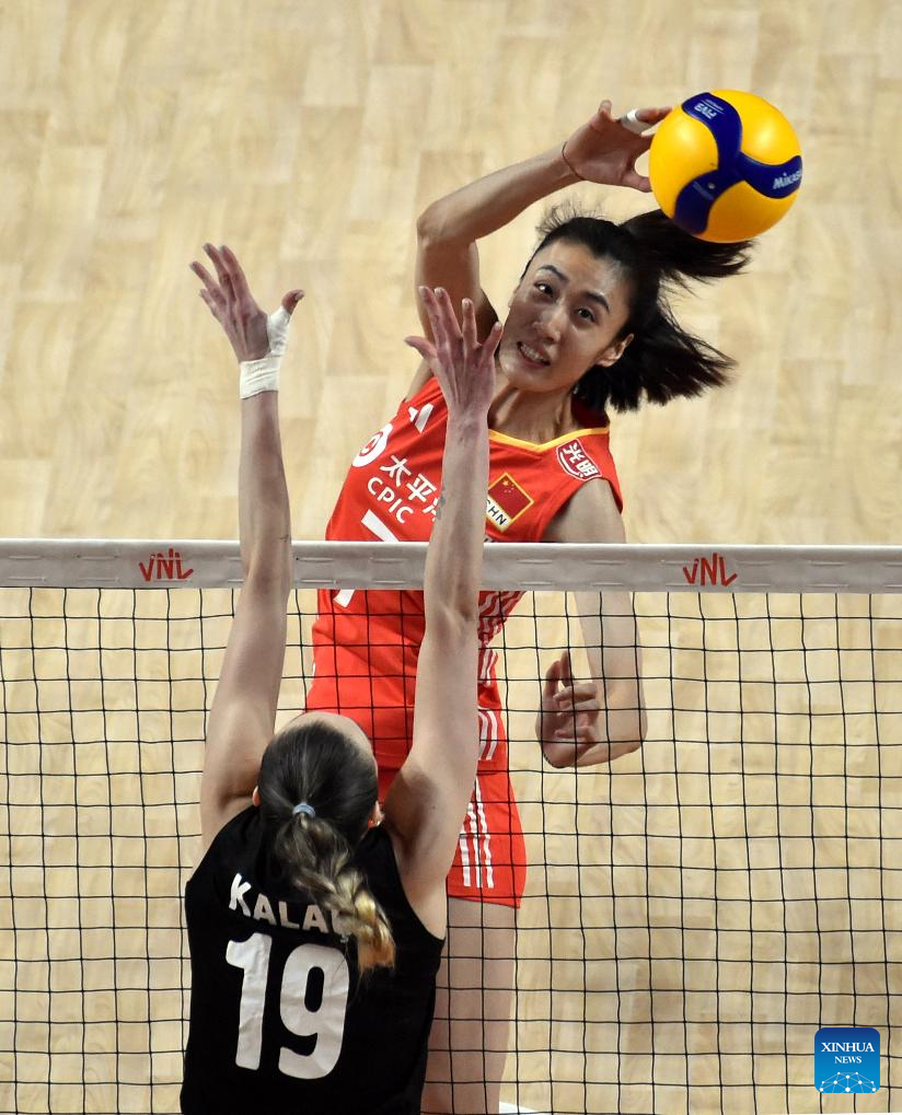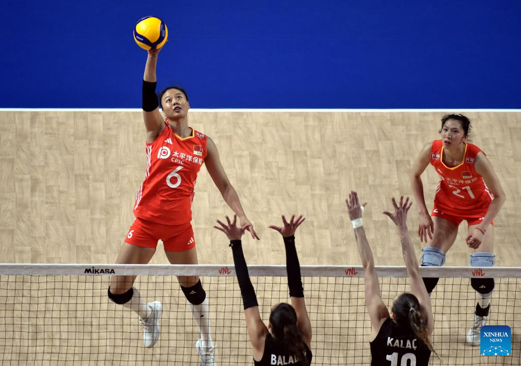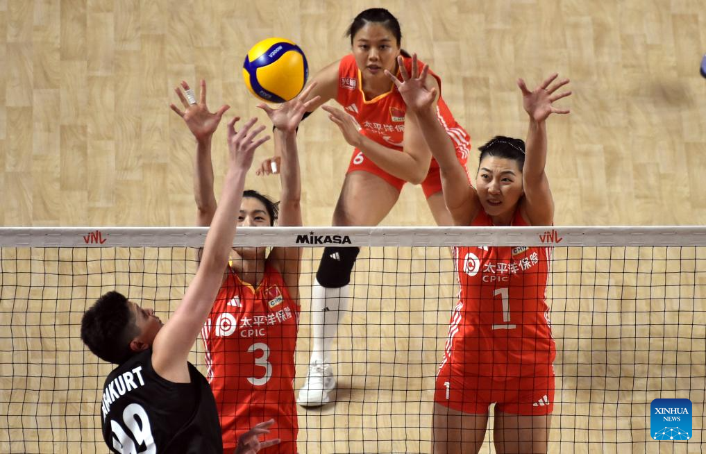 Gong Xiangyu (1st L) of China competes during the preliminary match between China and Trkiye at the Women's Volleyball Nations League 2024 Hong Kong in Hong Kong, south China, June 15, 2024. (Xinhua/Lo Ping Fai)