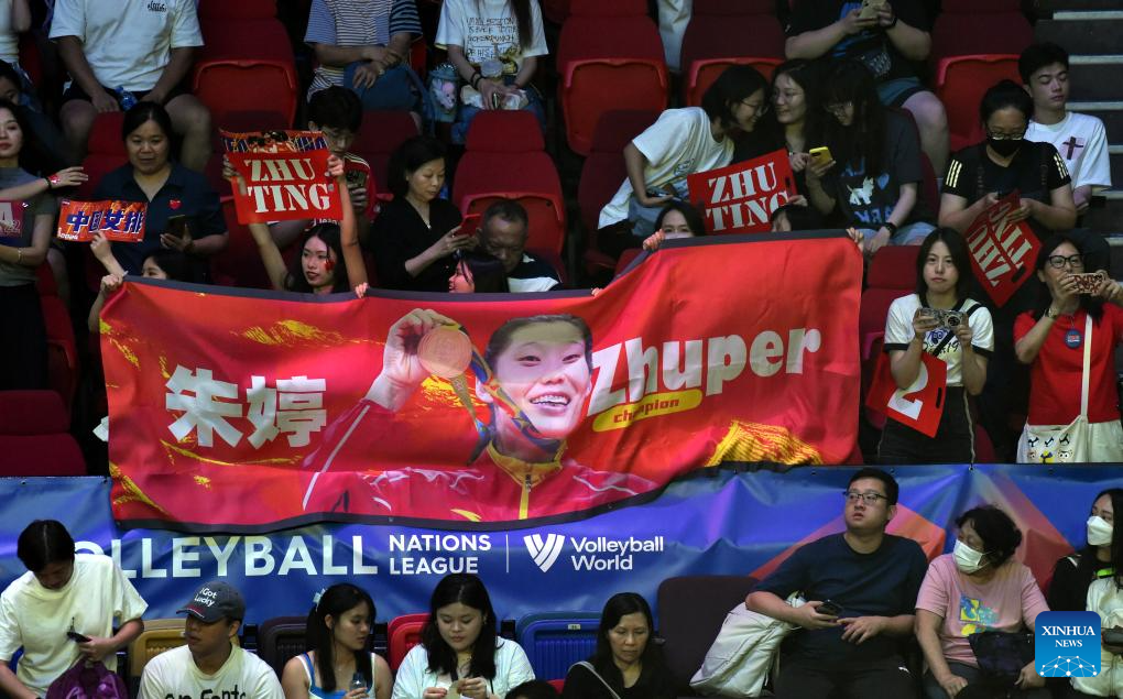Fans cheer for team China before the preliminary match between China and Trkiye at the Women's Volleyball Nations League 2024 Hong Kong in Hong Kong, south China, June 15, 2024. (Xinhua/Lo Ping Fai)
