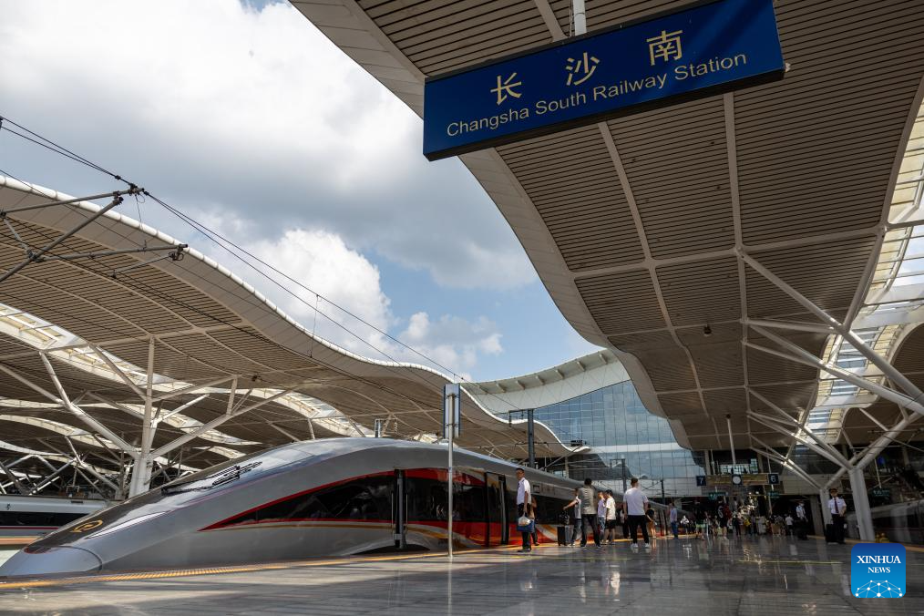 This photo taken on June 15, 2024 shows G875 bullet train bound for Shenzhen at Changsha South Railway Station in Changsha, capital of central China's Hunan Province. The Fuxing bullet trains on the Wuhan-Guangzhou section of the Beijing-Guangzhou high-speed railway started operating at a speed of 350 km/h on Saturday. As the backbone of the high-speed rail network in China, the 2,298-km Beijing-Guangzhou high-speed railway started normal operation at a speed of 350 km/h for Fuxing bullet trains on the whole line. (Xinhua/Wu Zhizun)