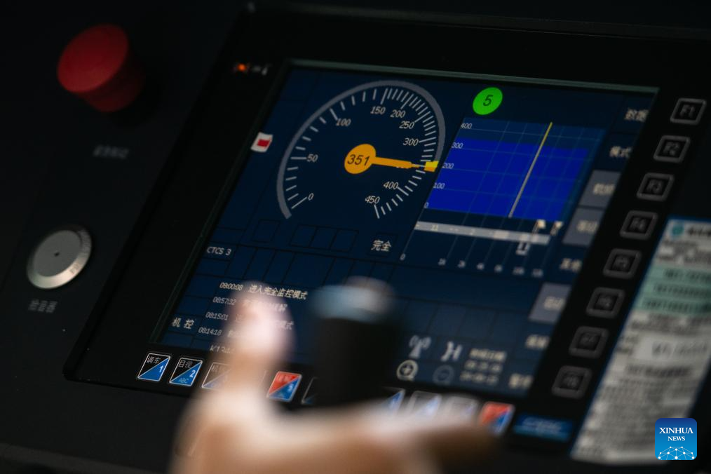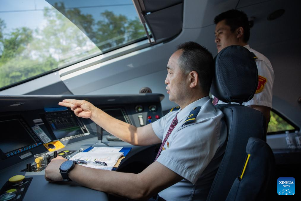 A driver checks the operational status of safety equipment onboard G875 bullet train bound for Shenzhen on June 15, 2024. The Fuxing bullet trains on the Wuhan-Guangzhou section of the Beijing-Guangzhou high-speed railway started operating at a speed of 350 km/h on Saturday. As the backbone of the high-speed rail network in China, the 2,298-km Beijing-Guangzhou high-speed railway started normal operation at a speed of 350 km/h for Fuxing bullet trains on the whole line. (Xinhua/Wu Zhizun)