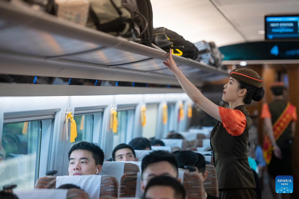 A train attendant checks the luggage rack onboard G875 bullet train bound for Shenzhen on June 15, 2024. The Fuxing bullet trains on the Wuhan-Guangzhou section of the Beijing-Guangzhou high-speed railway started operating at a speed of 350 km/h on Saturday. As the backbone of the high-speed rail network in China, the 2,298-km Beijing-Guangzhou high-speed railway started normal operation at a speed of 350 km/h for Fuxing bullet trains on the whole line. (Xinhua/Wu Zhizun)