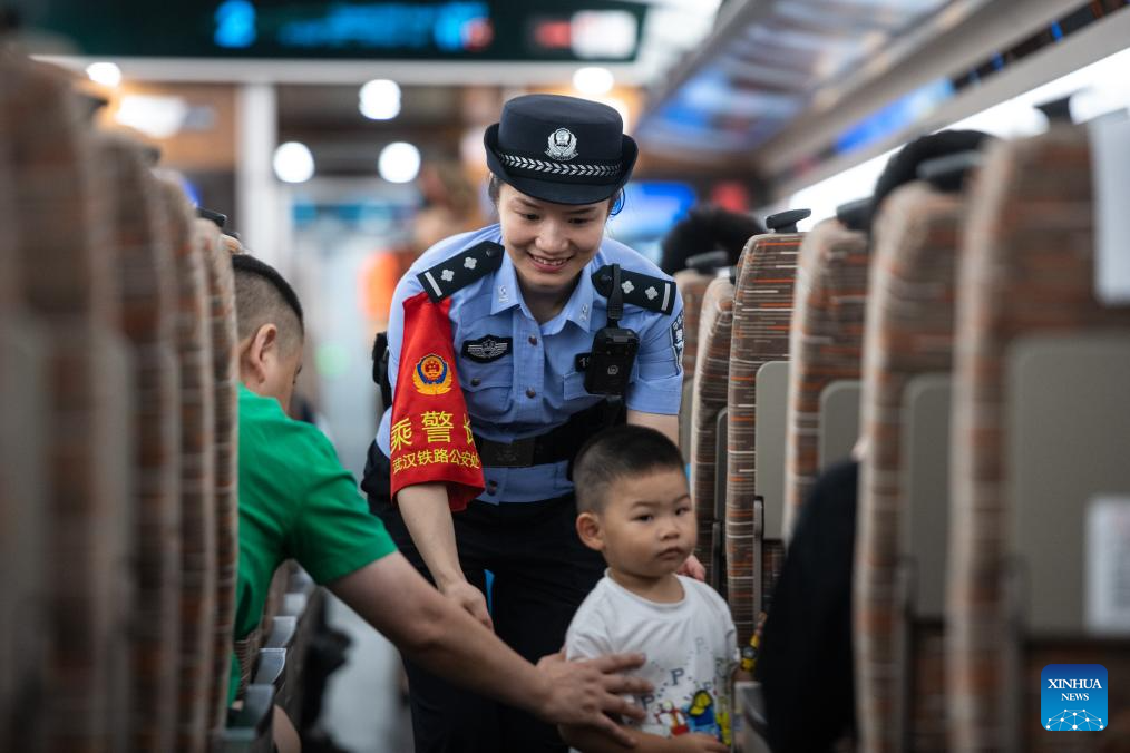 A railway policewoman guides a child back to the seat onboard G875 bullet train bound for Shenzhen on June 15, 2024. The Fuxing bullet trains on the Wuhan-Guangzhou section of the Beijing-Guangzhou high-speed railway started operating at a speed of 350 km/h on Saturday. As the backbone of the high-speed rail network in China, the 2,298-km Beijing-Guangzhou high-speed railway started normal operation at a speed of 350 km/h for Fuxing bullet trains on the whole line. (Xinhua/Wu Zhizun)