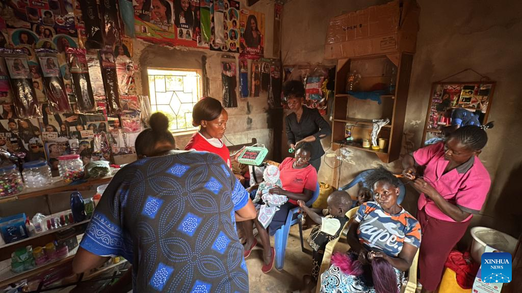 Local women participate in a hairdressing lesson delivered on a solar-powered tablet in a makeshift salon in Makueni, Kenya, June 6, 2024.(Photo by Lin Jing/Xinhua)