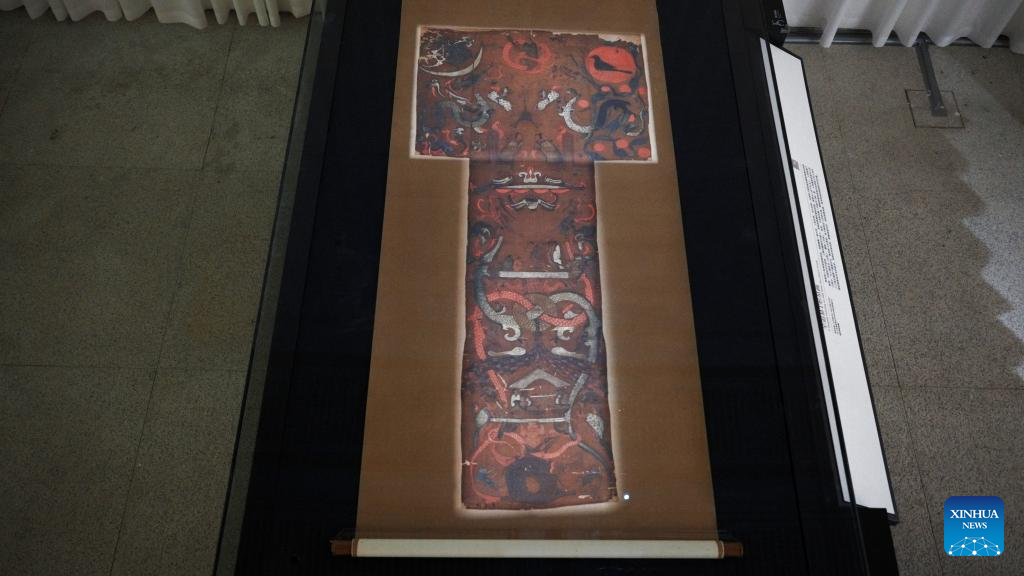 This photo taken on June 14, 2024 shows a T-shaped painting on silk unearthed from Lady Xin Zhui's tomb, now displayed at the Hunan Museum in Changsha, central China's Hunan Province. (Hunan Museum/Handout via Xinhua)