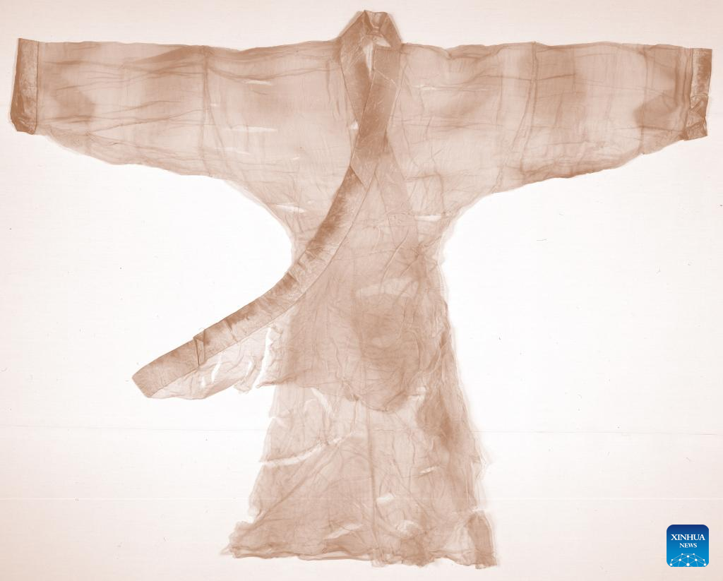 This undated file photo shows a plain unlined gauze gown with curved hem unearthed from Lady Xin Zhui's tomb, now displayed at the Hunan Museum in Changsha, central China's Hunan Province. (Hunan Museum/Handout via Xinhua)