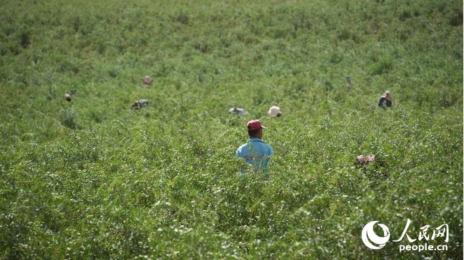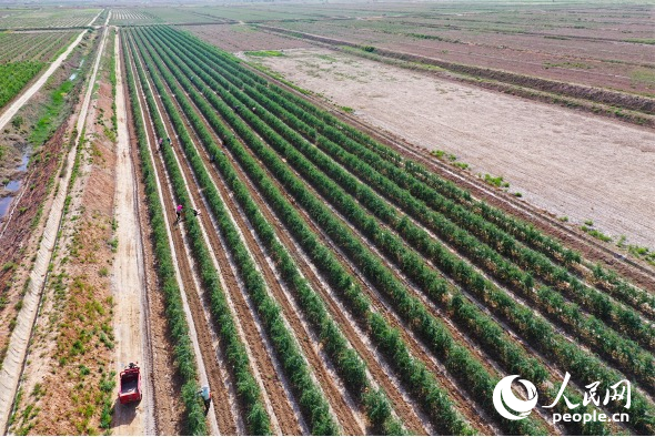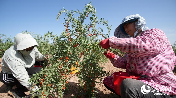 Workers pick goji berries in a planting base in Zhongwei, Ningxia Hui Autonomous Region. (Photo/People's Daily Online)