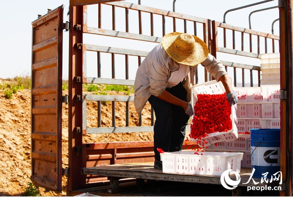 Goji berries are loaded into a car. (Photo/People's Daily Online)
