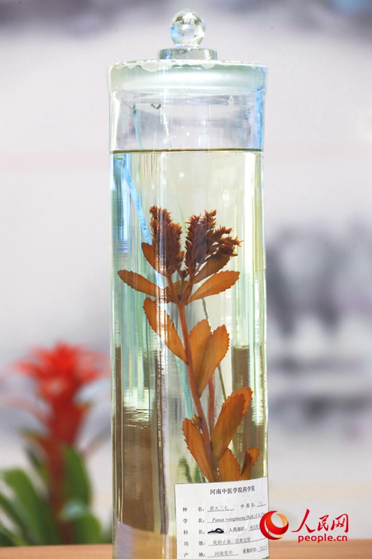 Photo shows a specimen of Sanqi, or panax notoginseng, an herb mainly grown in southern China, in the Central Plains Medical Sciences City, Zhengzhou, central China’s Henan Province. (People’s Daily Online/Huo Yaping)