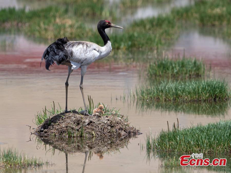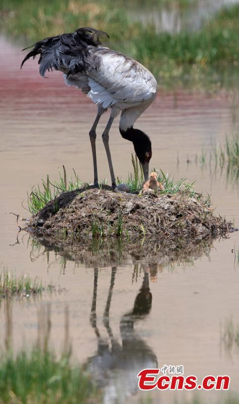 A black-necked crane embraces his newborn babe on Father's Day on June 16 in Xainza County of Nagqu City, China's Xizang Autonomous Region.(Photo: China News Service/ Gongga Laisong)