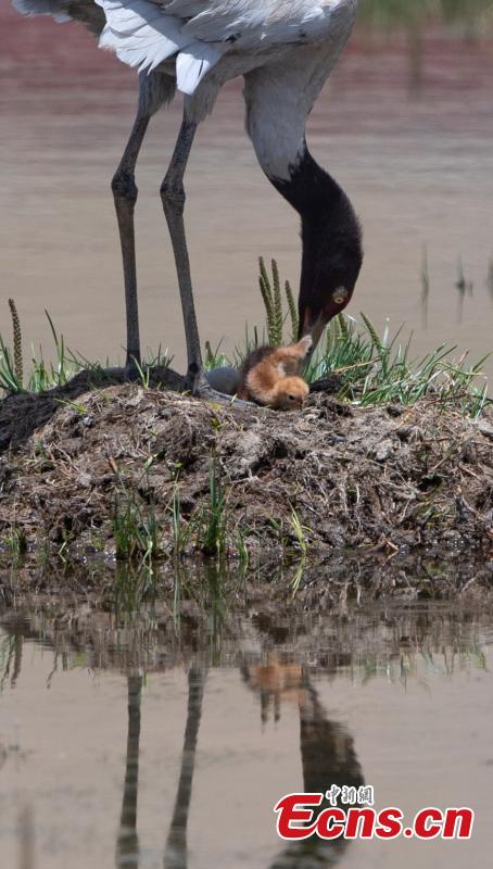 Black-necked crane in Xizang embraces newborn babe on Father's Day