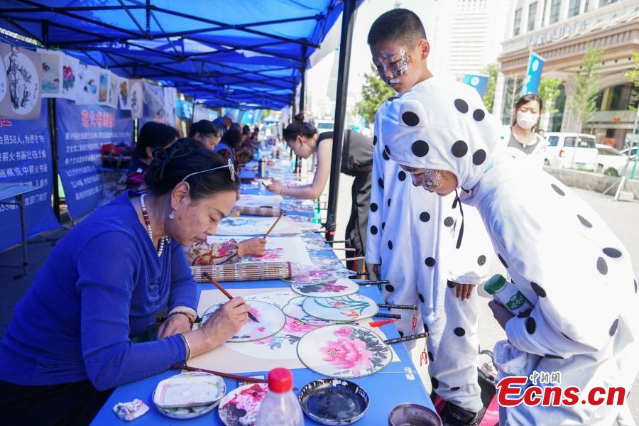 Outside the playing field, teenagers admire fan paintings in Xining, capital of Qinghai Province on June 16. (Photo: China News Service/ Ma Mingyan)