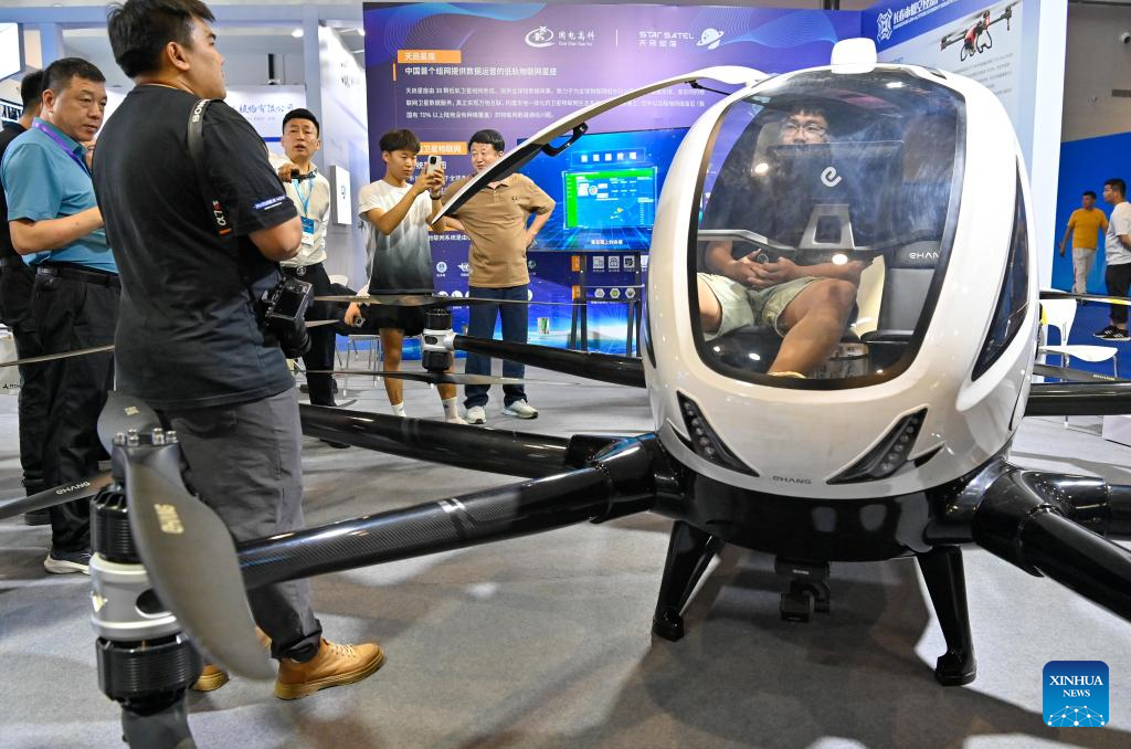 Visitors look at an EH216-S unmanned aerial vehicle during the 2024 Changchun International Optoelectronic Expo in Changchun, northeast China's Jilin Province, June 18, 2024.