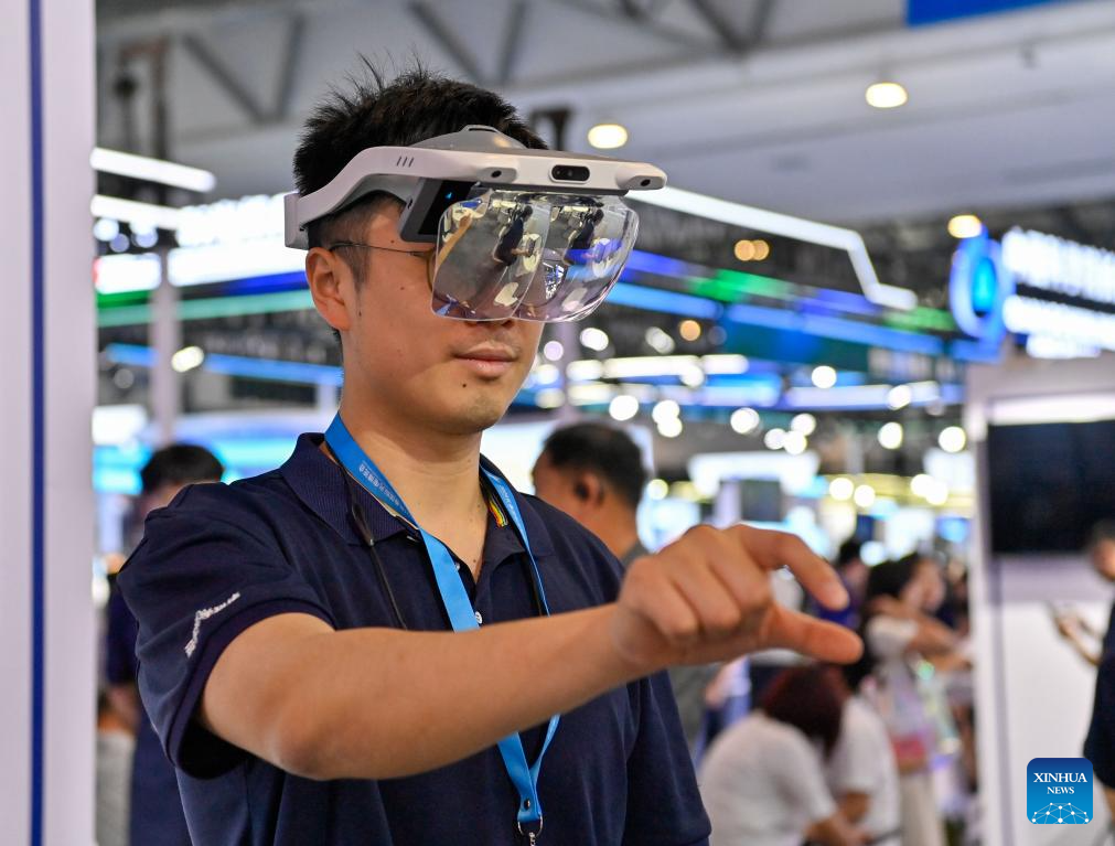 A visitor tries on VR glasses during the 2024 Changchun International Optoelectronic Expo in Changchun, northeast China's Jilin Province, June 18, 2024.