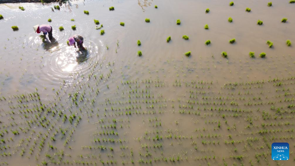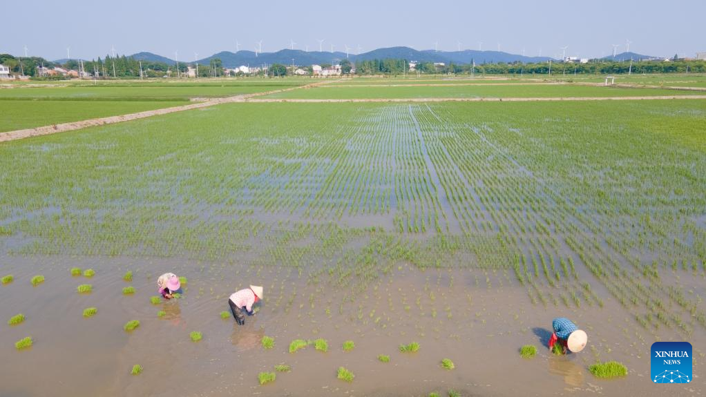 An aerial drone photo taken on June 17, 2024 shows villagers transplanting seedlings in the rice field near Chaohu Lake in Huailin Township of Chaohu City, east China's Anhui Province. In recent years, local authorities in Chaohu Lake in east China's Anhui Province and Datong Lake in central China's Hunan Province have promoted green rice planting and smart farming through fertilizer reduction and efficiency improvement, prevention and control of diseases and pests, and the establishment of smart agricultural platforms, so as to improve agricultural development. (Xinhua/Zhang Duan)