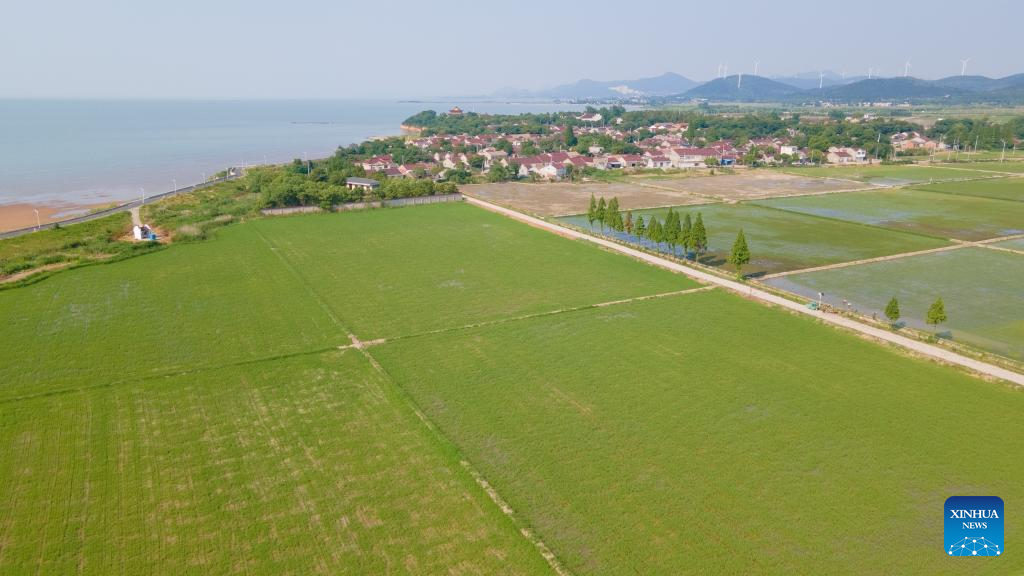 An aerial drone photo taken on June 17, 2024 shows the rice field near Chaohu Lake in Huailin Township of Chaohu City, east China's Anhui Province. In recent years, local authorities in Chaohu Lake in east China's Anhui Province and Datong Lake in central China's Hunan Province have promoted green rice planting and smart farming through fertilizer reduction and efficiency improvement, prevention and control of diseases and pests, and the establishment of smart agricultural platforms, so as to improve agricultural development. (Xinhua/Zhang Duan)
