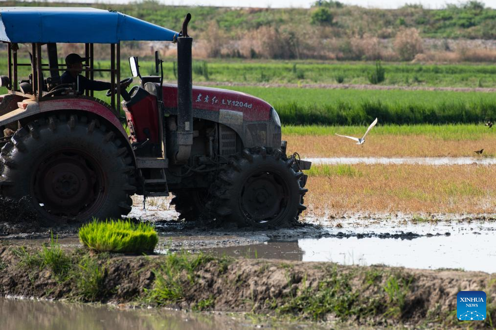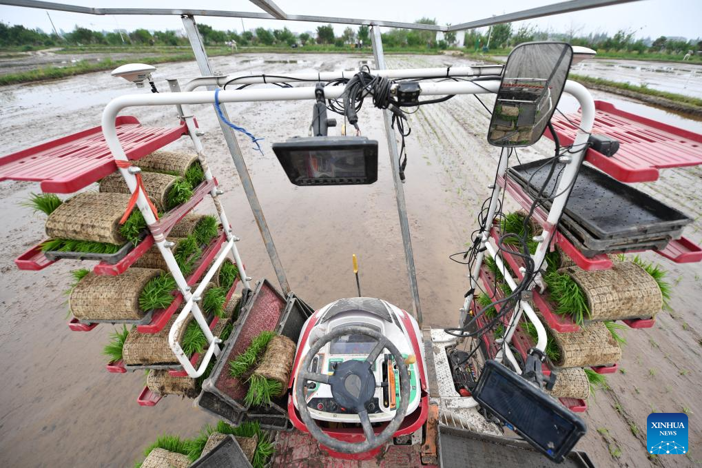 An autonomous rice transplanter works at a smart planting base in Datonghu District of Yiyang City, central China's Hunan Province, April 10, 2024. In recent years, local authorities in Chaohu Lake in east China's Anhui Province and Datong Lake in central China's Hunan Province have promoted green rice planting and smart farming through fertilizer reduction and efficiency improvement, prevention and control of diseases and pests, and the establishment of smart agricultural platforms, so as to improve agricultural development. (Xinhua/Chen Zhenhai)