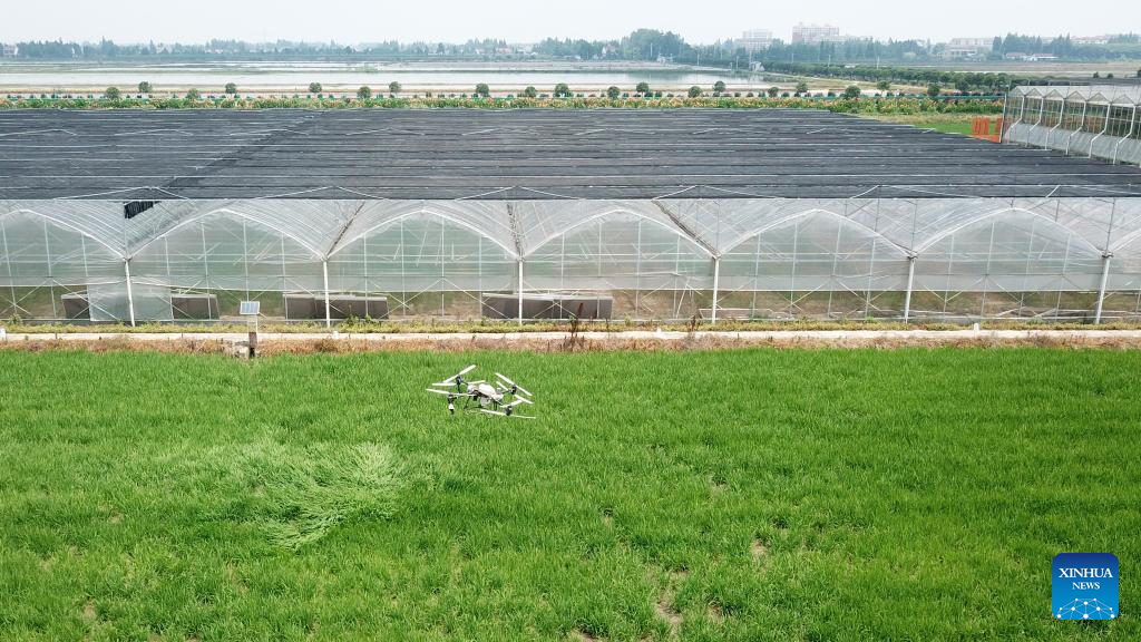 A plant protection drone works at a smart planting base in Datonghu District of Yiyang City, central China's Hunan Province, June 6, 2024. In recent years, local authorities in Chaohu Lake in east China's Anhui Province and Datong Lake in central China's Hunan Province have promoted green rice planting and smart farming through fertilizer reduction and efficiency improvement, prevention and control of diseases and pests, and the establishment of smart agricultural platforms, so as to improve agricultural development. (Xinhua/Chen Zhenhai)