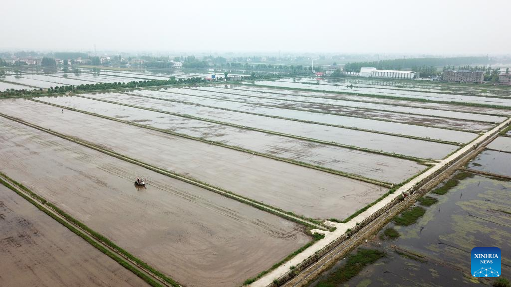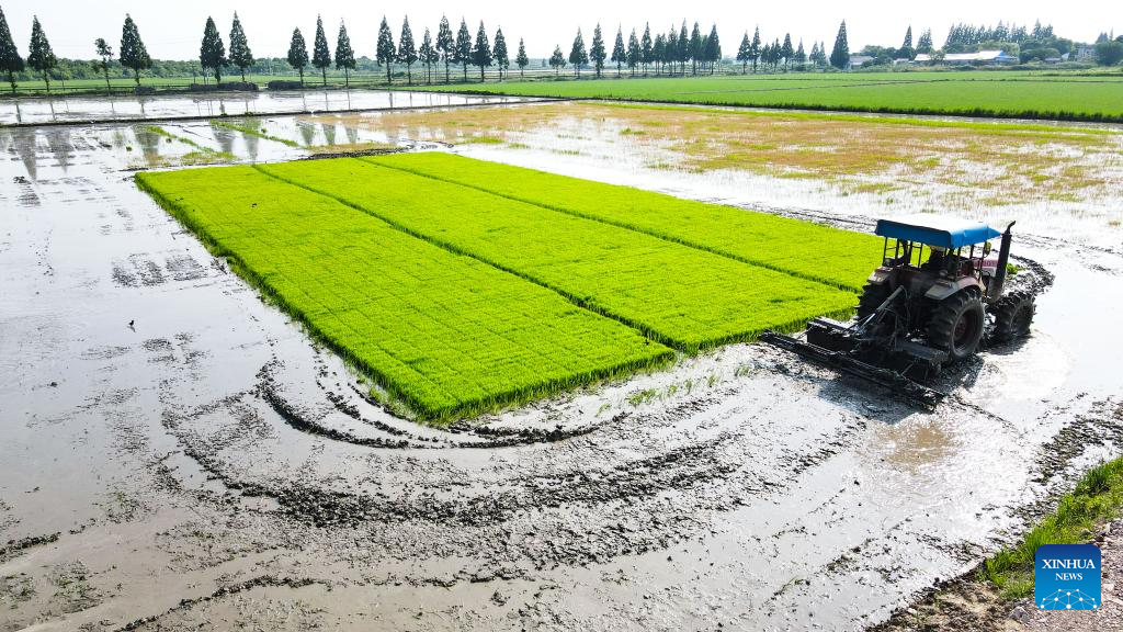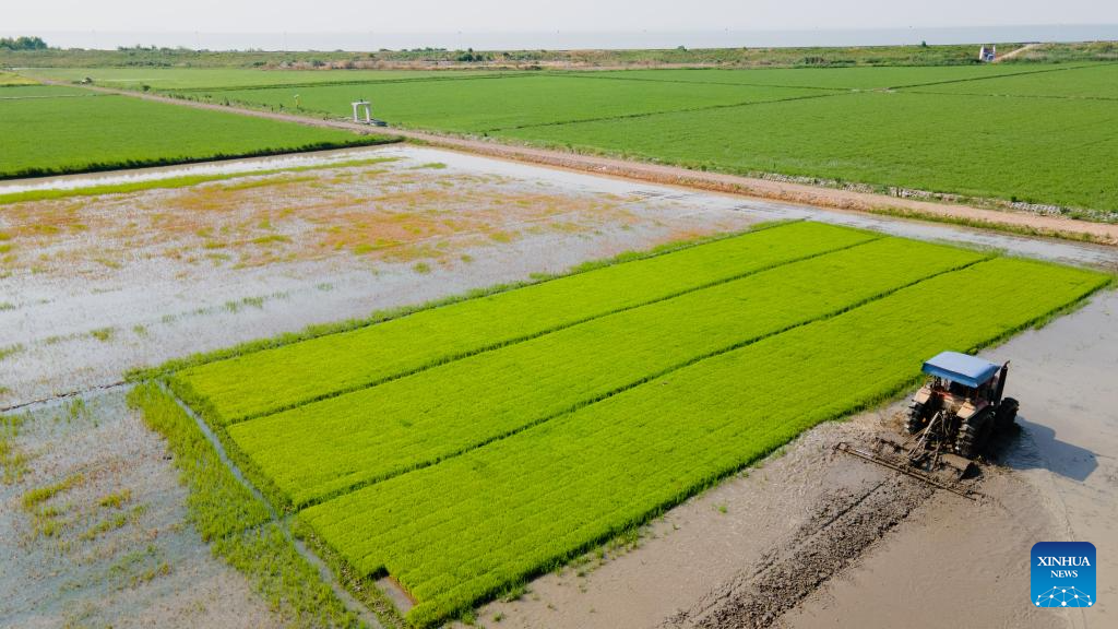 An agricultural machinery works in the rice field near Chaohu Lake in Huailin Township of Chaohu City, east China's Anhui Province, June 17, 2024. In recent years, local authorities in Chaohu Lake in east China's Anhui Province and Datong Lake in central China's Hunan Province have promoted green rice planting and smart farming through fertilizer reduction and efficiency improvement, prevention and control of diseases and pests, and the establishment of smart agricultural platforms, so as to improve agricultural development. (Xinhua/Zhang Duan)
