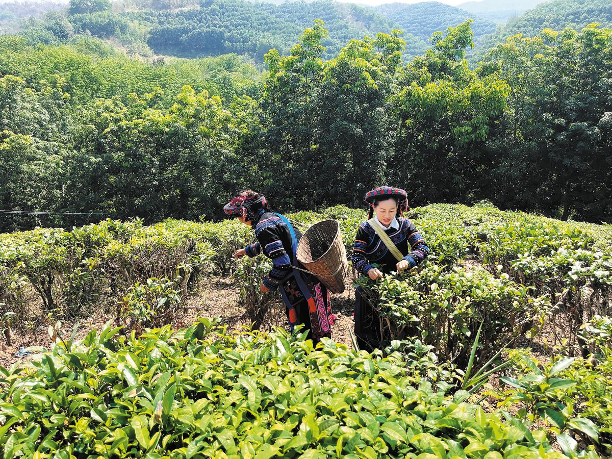 Villagers harvest tea leaves in the Konggeliudui community in Jinghong, Yunnan province. CHEN LIANG/CHINA DAILY