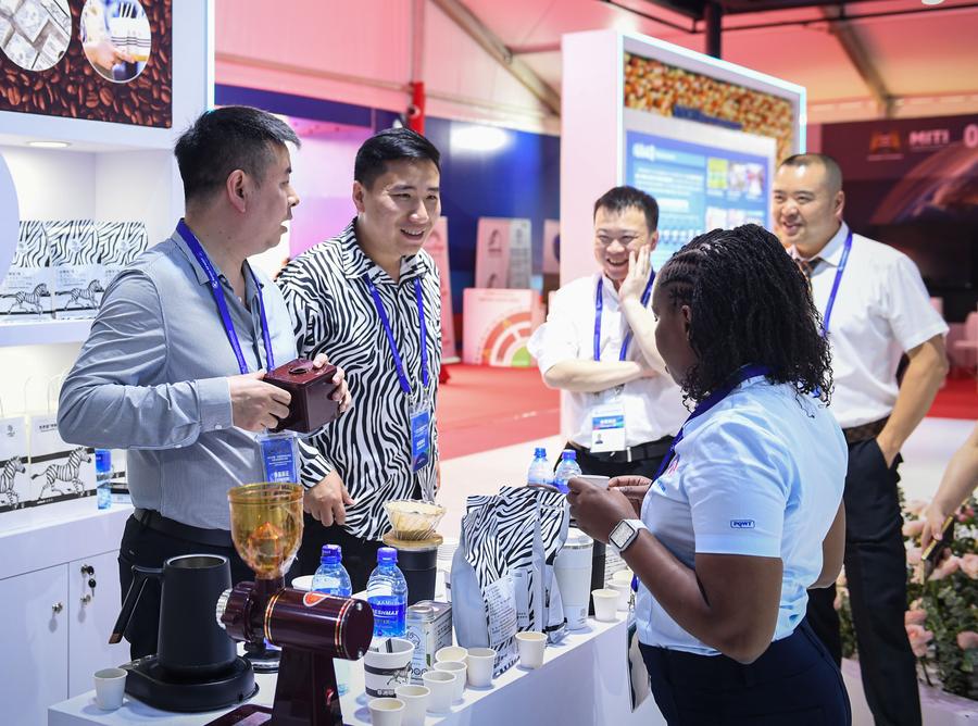A coffee exhibitor shows coffee products during an exhibition of the China-Africa Economic and Trade Expo in Nairobi, Kenya, May 9, 2024. (Xinhua/Li Yahui)