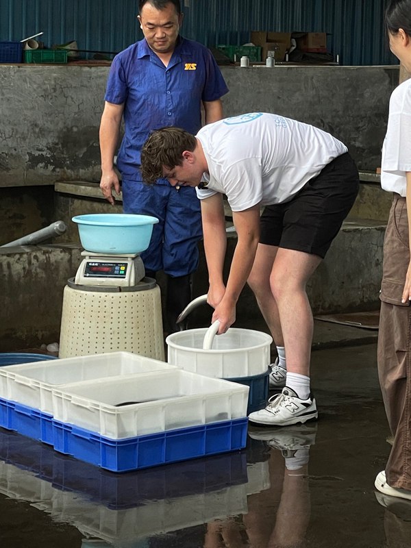 British student Matt Smith catches an eel at an aquatic products company in Foshan, south China's Guangdong Province, June 16, 2024. (Photo provided to People's Daily Online)