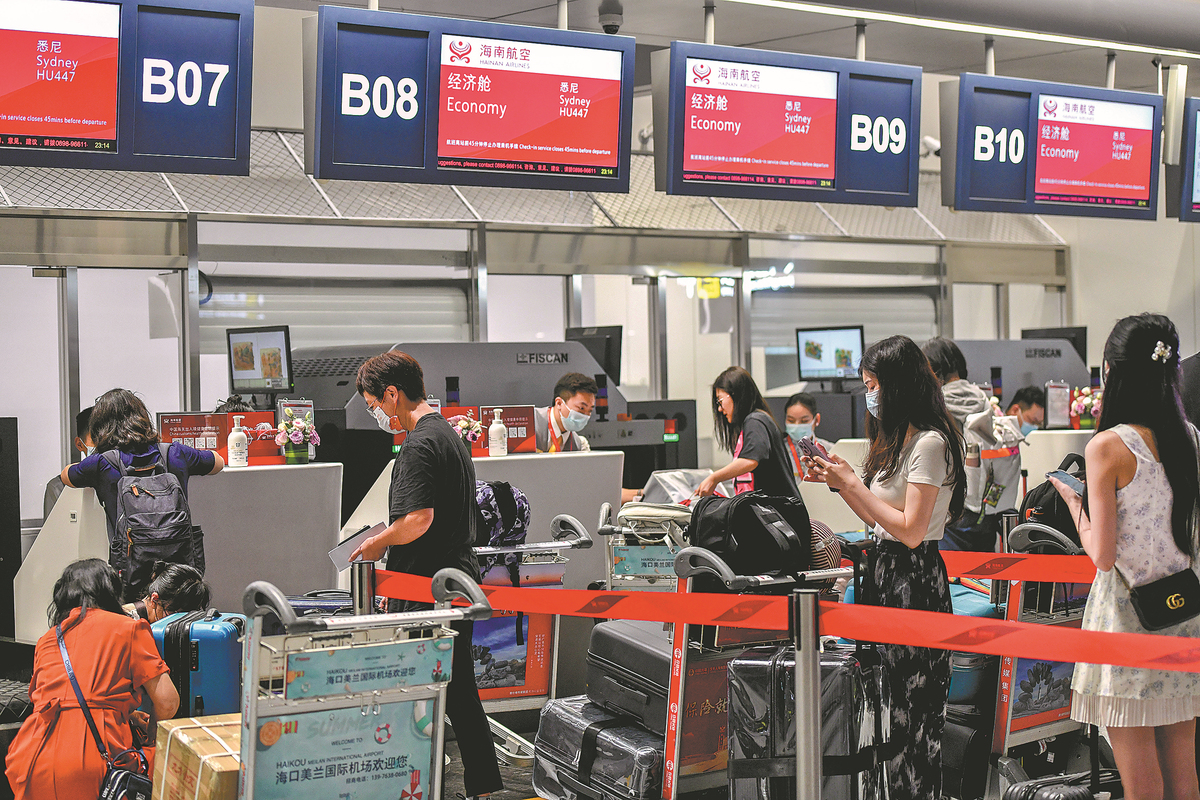 Passengers bound for Sydney line up for check-in at Haikou Meilan International Airport in Hainan province. LUO YUNFEI/CHINA NEWS SERVICE