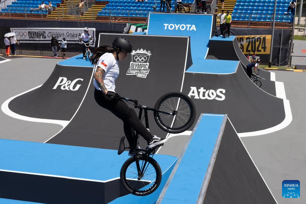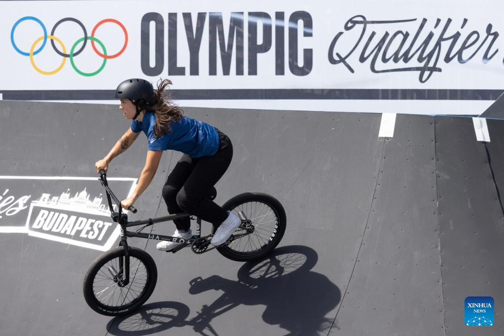 A BMX cyclist practices prior to the Olympic Qualifier Series Budapest in Budapest, Hungary, June 19, 2024. The Olympic Qualifier Series for BMX freestyle, skateboarding, breaking and sport climbing will be held in Budapest, Hungary from June 20 to 23, 2024. (Photo by Attila Volgyi/Xinhua)