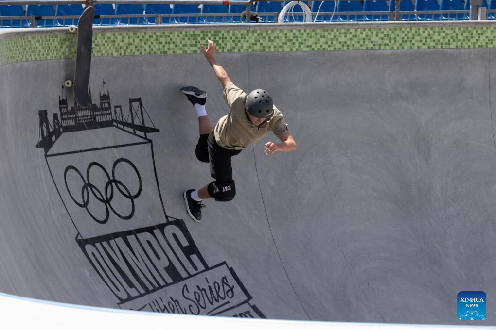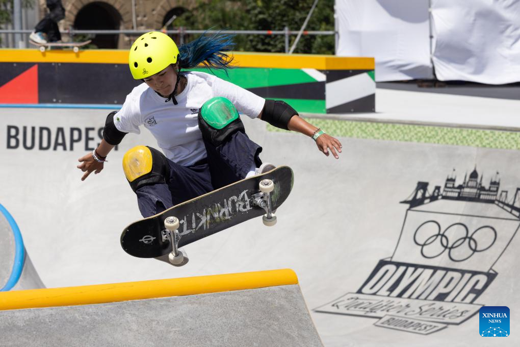 A skateboarder practices prior to the Olympic Qualifier Series Budapest in Budapest, Hungary, June 19, 2024. The Olympic Qualifier Series for BMX freestyle, skateboarding, breaking and sport climbing will be held in Budapest, Hungary from June 20 to 23, 2024. (Photo by Attila Volgyi/Xinhua)