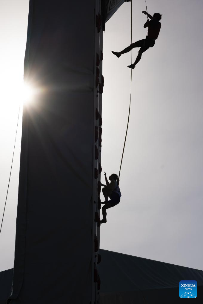 Climbers practice prior to the Olympic Qualifier Series Budapest in Budapest, Hungary, June 19, 2024. The Olympic Qualifier Series for BMX freestyle, skateboarding, breaking and sport climbing will be held in Budapest, Hungary from June 20 to 23, 2024. (Photo by Attila Volgyi/Xinhua)
