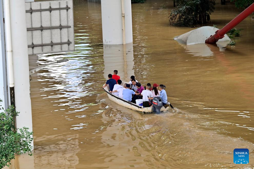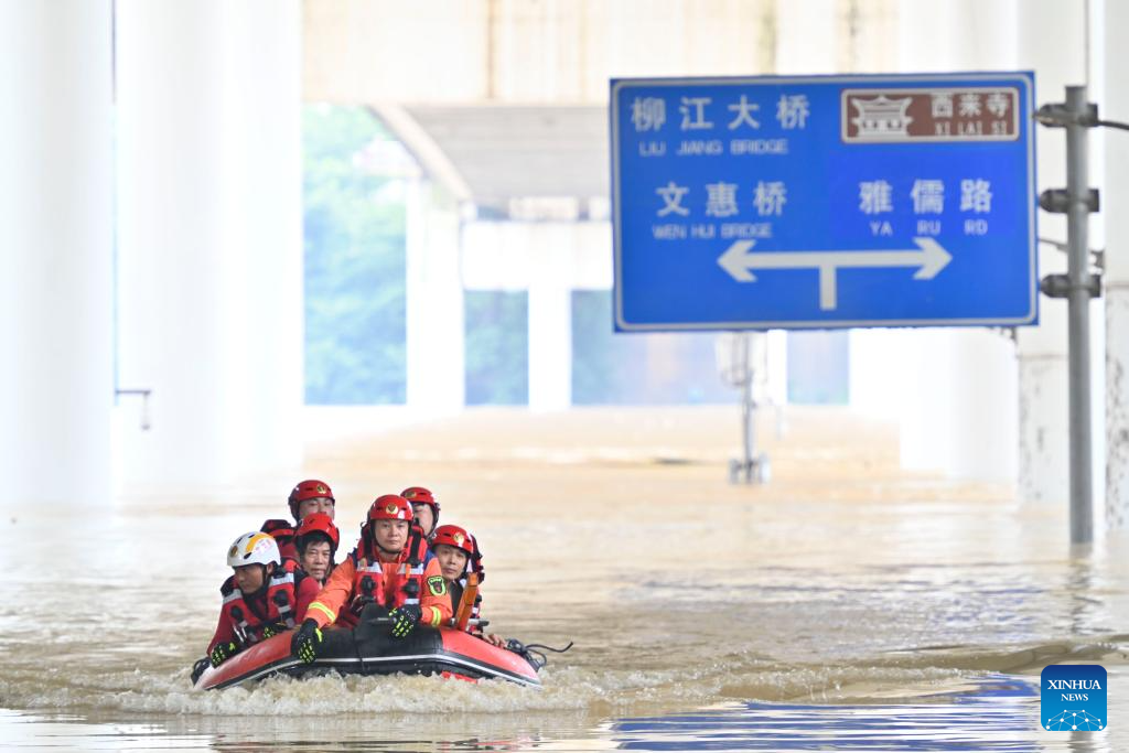 Firefighters evacuate flood-stranded residents in Liuzhou City, south China's Guangxi Zhuang Autonomous Region, June 19, 2024. Due to heavy rainfall, water level at the Liuzhou hydrological station on the Liujiang River in Guangxi rose to 86.3 meters at 9:40 a.m. Wednesday, exceeding the alert line by 3.8 meters. (Xinhua/Huang Xiaobang)