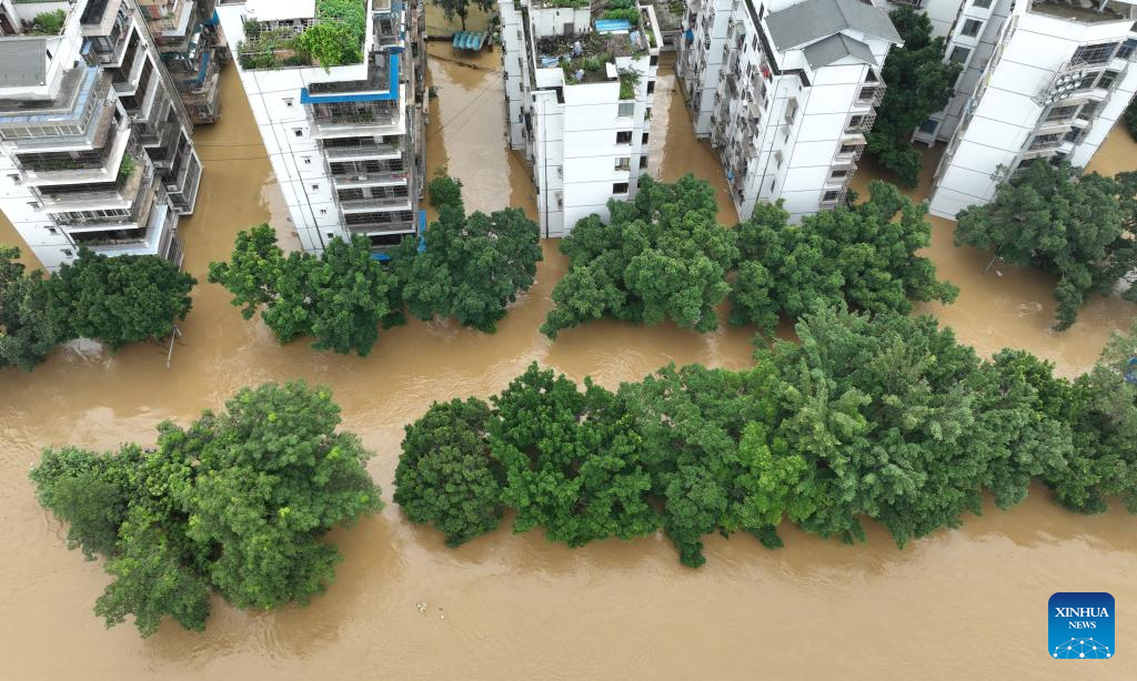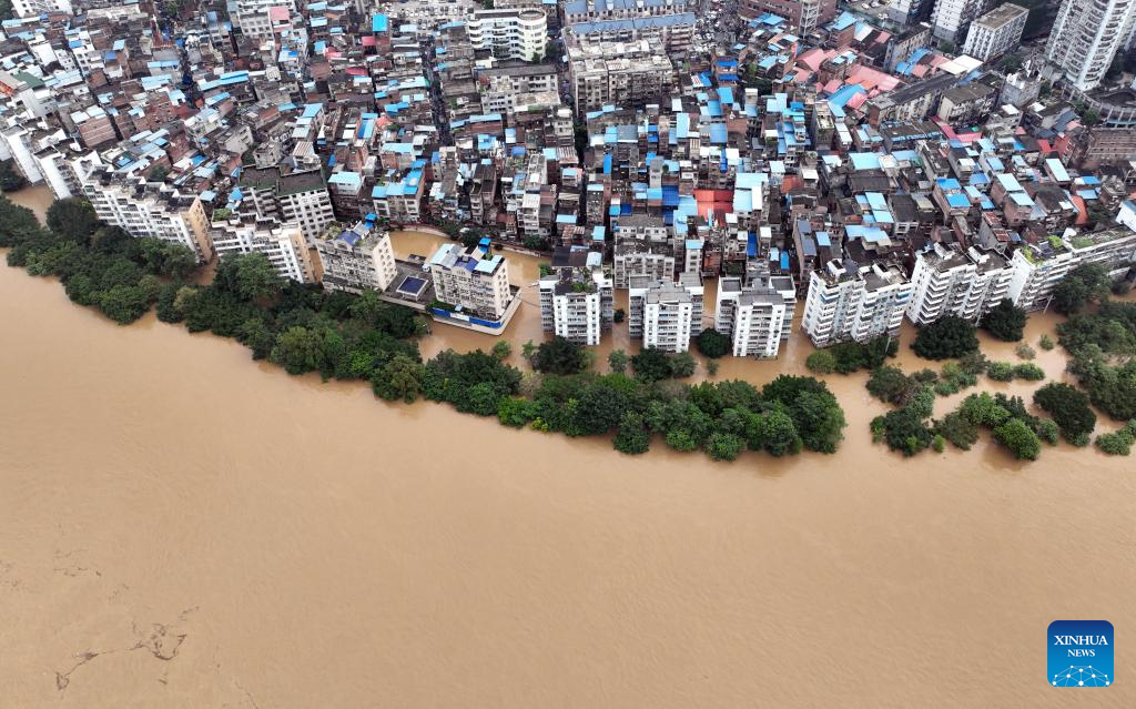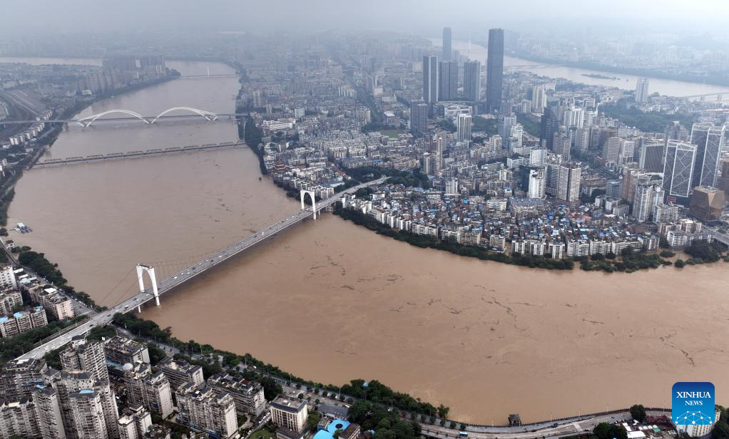 An aerial drone photo taken on June 19, 2024 shows flood-affected areas in Liuzhou City, south China's Guangxi Zhuang Autonomous Region. Due to heavy rainfall, water level at the Liuzhou hydrological station on the Liujiang River in Guangxi rose to 86.3 meters at 9:40 a.m. Wednesday, exceeding the alert line by 3.8 meters. (Xinhua/Huang Xiaobang)
