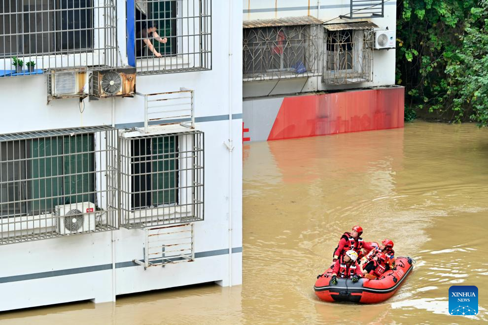 Firefighters prepare to evacuate a flood-stranded resident in Liuzhou City, south China's Guangxi Zhuang Autonomous Region, June 19, 2024. Due to heavy rainfall, water level at the Liuzhou hydrological station on the Liujiang River in Guangxi rose to 86.3 meters at 9:40 a.m. Wednesday, exceeding the alert line by 3.8 meters. (Xinhua/Huang Xiaobang)