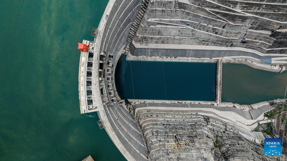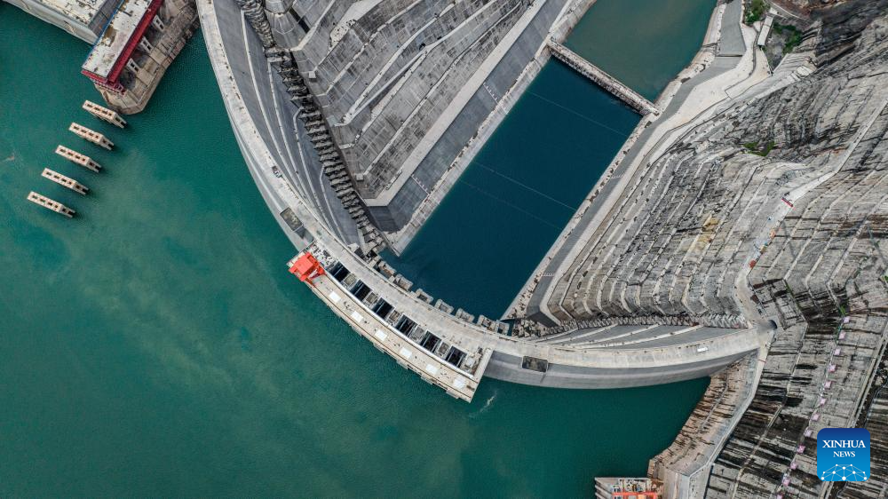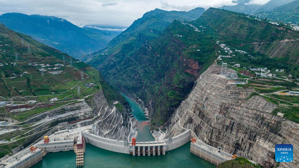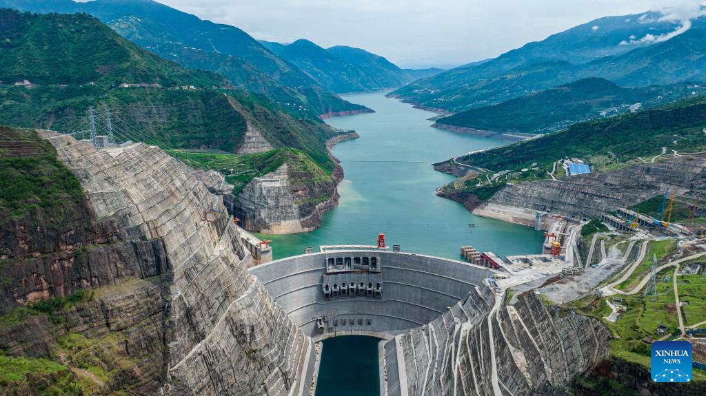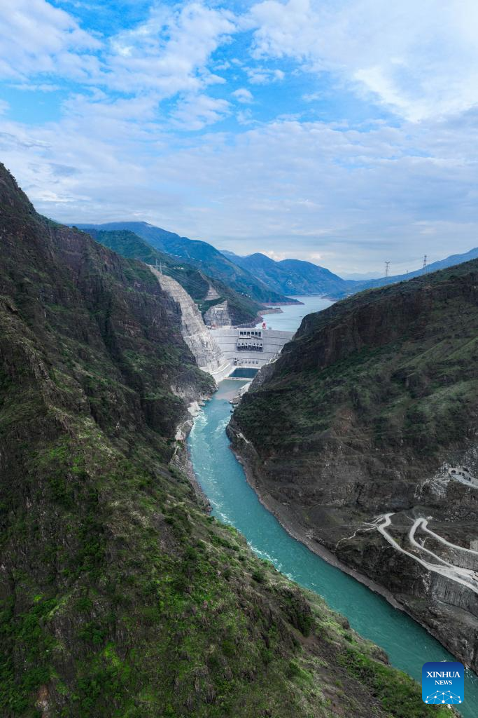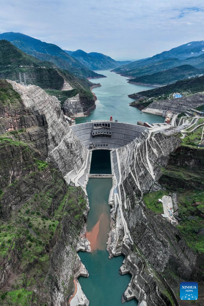 An aerial drone photo taken on June 19, 2024 shows a view of the Baihetan hydropower station in southwest China. Riding on the Jinsha River, the upper section of the Yangtze River, at the provincial border between Sichuan and Yunnan, the Baihetan hydropower station has a total installed capacity of 16 million kilowatts, second only to the Three Gorges Dam project. (Xinhua/Hu Chao)