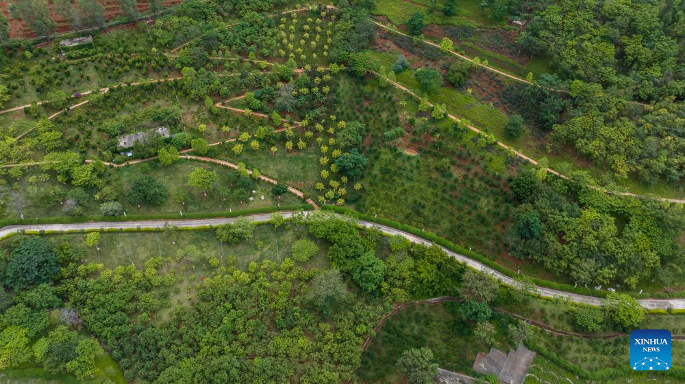 An aerial drone photo taken on June 19, 2024 shows a botanic garden near the Baihetan hydropower station in southwest China. Riding on the Jinsha River, the upper section of the Yangtze River, at the provincial border between Sichuan and Yunnan, the Baihetan hydropower station has a total installed capacity of 16 million kilowatts, second only to the Three Gorges Dam project. (Xinhua/Hu Chao)