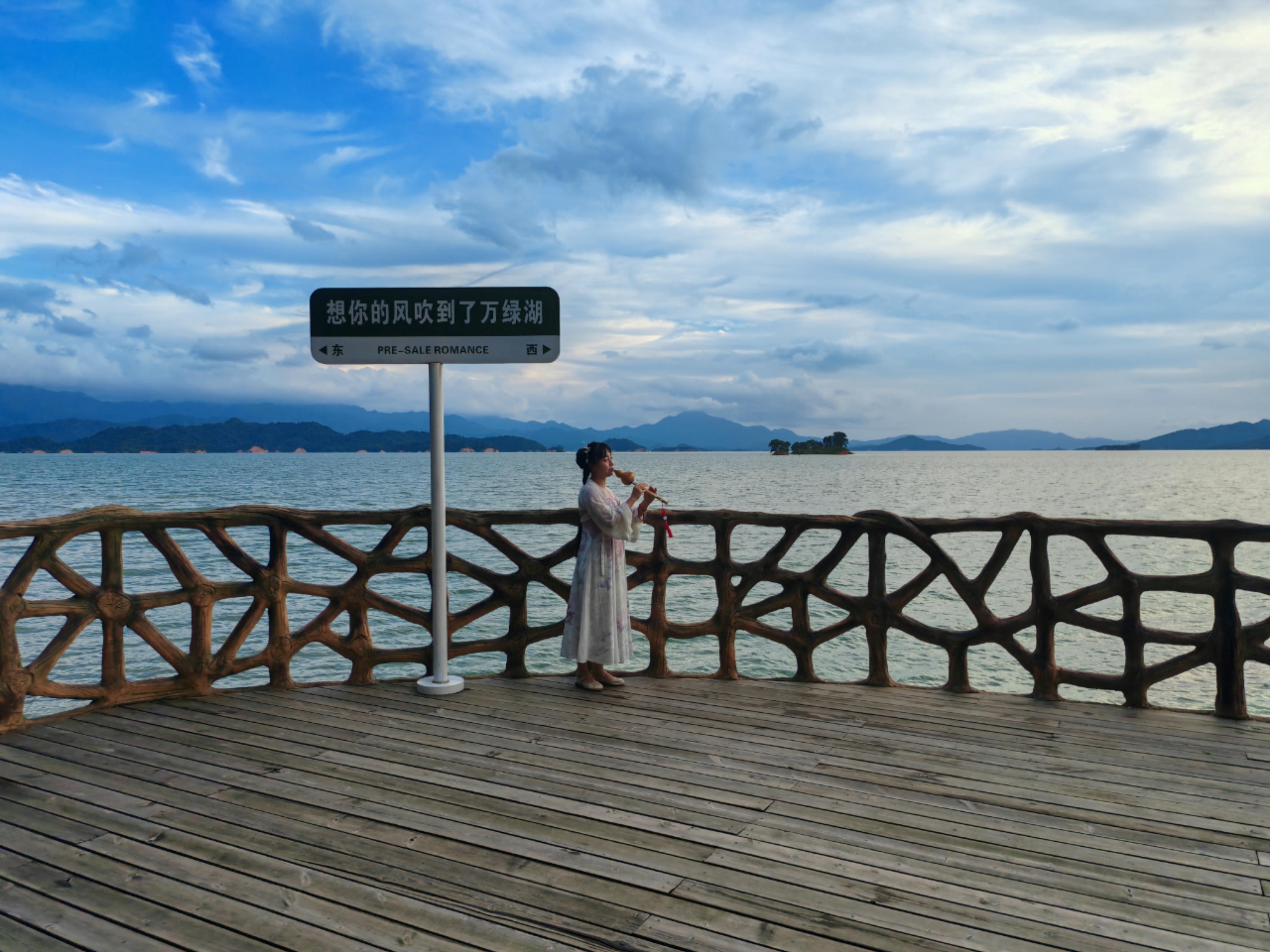 Photo taken on June 19, 2024, shows a tourist playing a musical instrument at Wanlyu Lake scenic area, located in Dongyuan county, Heyuan city, south China's Guangdong Province. (People's Daily Online/Zhangkaiwei)