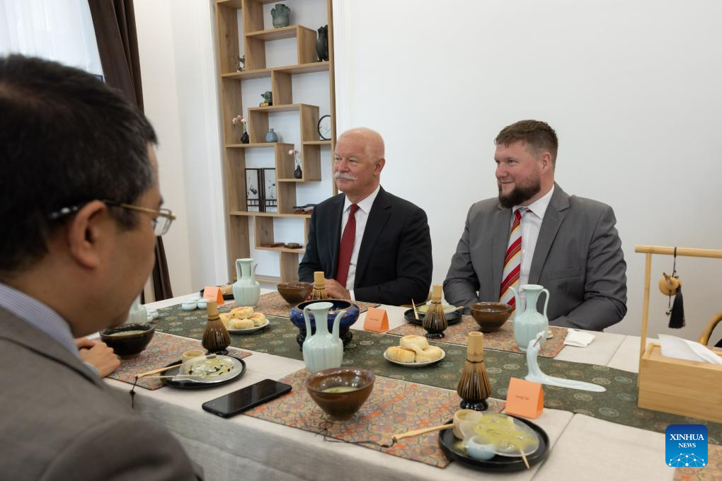 Hungarian Minister of Culture and Innovation Janos Csak (L, Rear) attends a tea ceremony presentation at the China Cultural Center in Budapest, Hungary, on June 20, 2024. The China Cultural Center in Budapest sprung into life on Thursday, with an opening event featuring a photo exhibition and an interactive tea show. (Photo by Attila Volgyi/Xinhua)