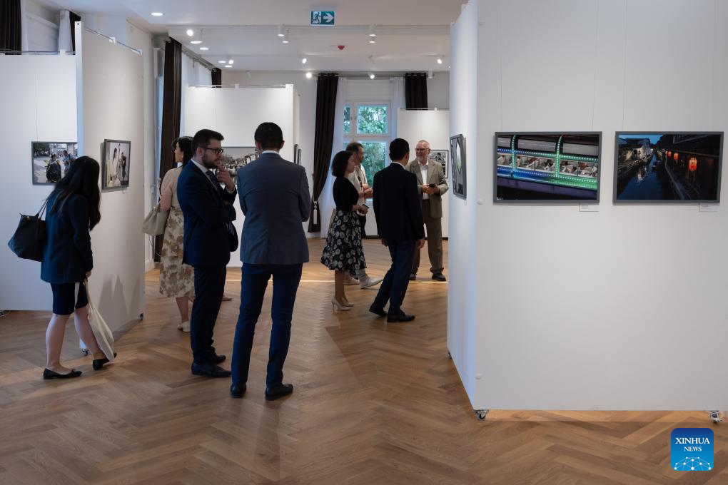 People watch a photo exhibition called "Silk Road's Reflection - China Through the Eyes of Hungarian Photographers" at the China Cultural Center in Budapest, Hungary, on June 20, 2024. The China Cultural Center in Budapest sprung into life on Thursday, with an opening event featuring a photo exhibition and an interactive tea show. (Photo by Attila Volgyi/Xinhua)