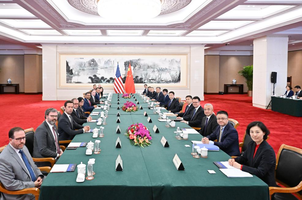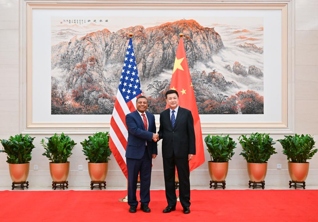 Chinese State Councilor and Director of the China National Narcotic Control Committee Wang Xiaohong meets with Rahul Gupta, director of the White House Office of National Drug Control Policy, in Beijing, capital of China, June 20, 2024. (Xinhua/Li Xiang)