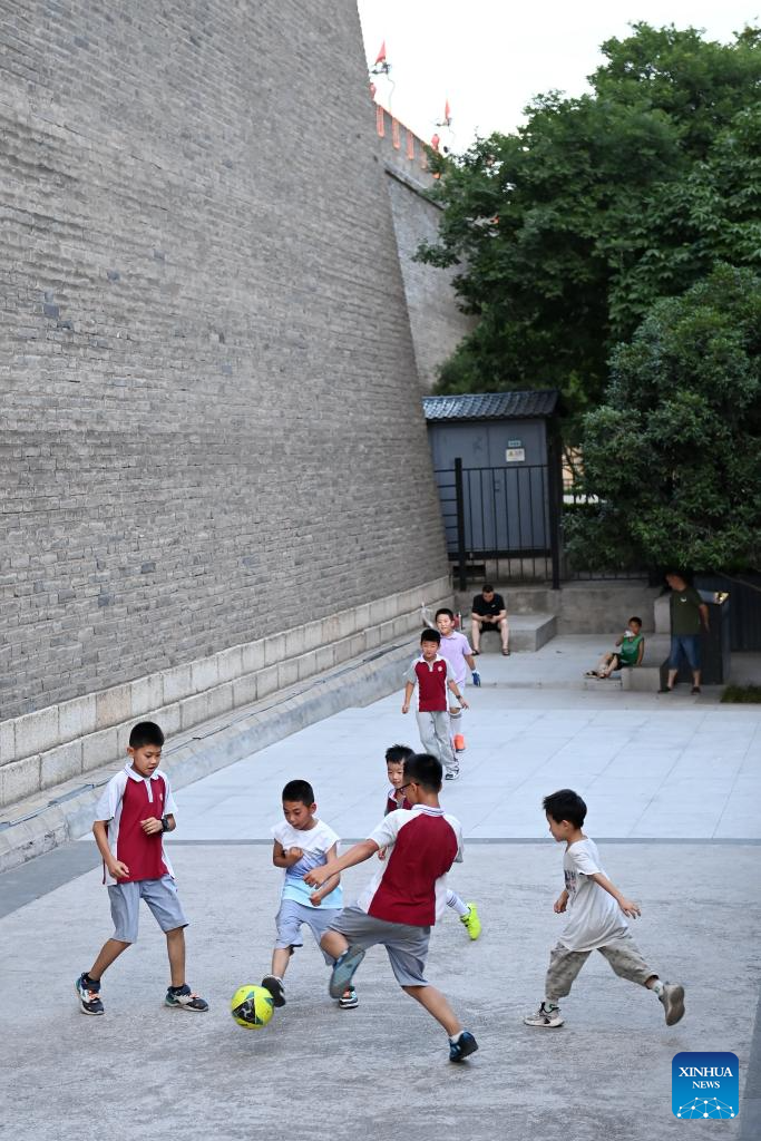 Photo taken on June 18, 2024 shows children playing football near ancient city wall in Xi'an, northwest China's Shaanxi Province. Xi'an, a city with over 3,100 years of history, served as the capital for 13 dynasties in Chinese history. It is also home to the world-renowned Terracotta warriors created in the Qin Dynasty (221-207 BC).
