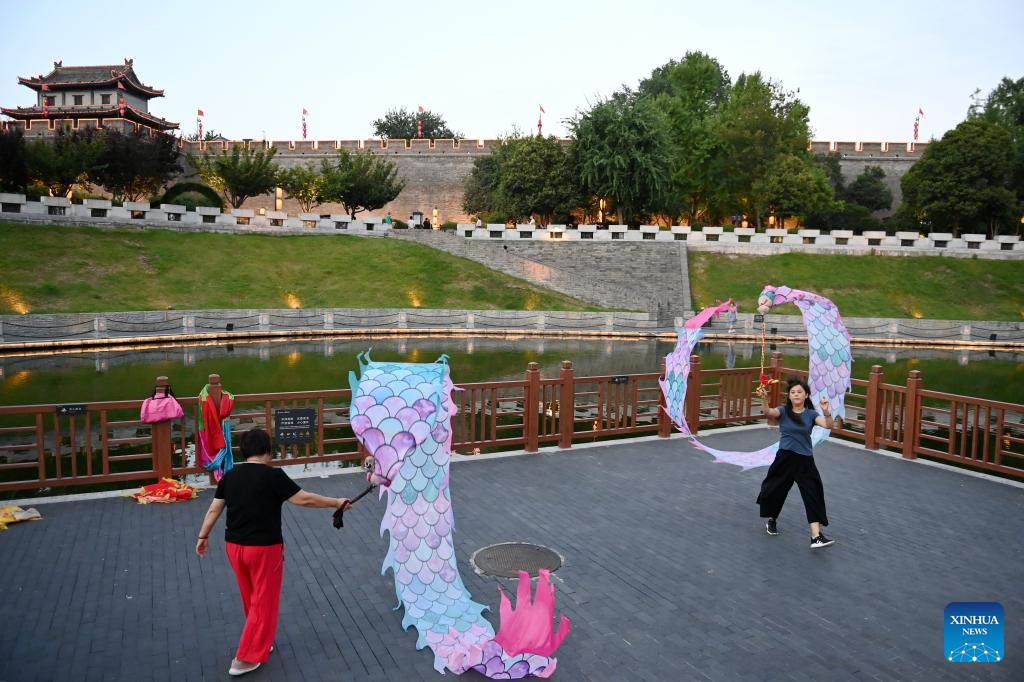 Photo taken on June 17, 2024 shows residents practicing dragon dance near ancient city wall in Xi'an, northwest China's Shaanxi Province. Xi'an, a city with over 3,100 years of history, served as the capital for 13 dynasties in Chinese history. It is also home to the world-renowned Terracotta warriors created in the Qin Dynasty (221-207 BC).