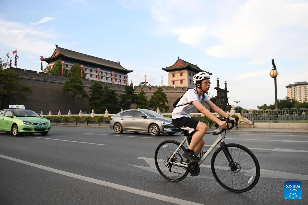 Photo taken on June 18, 2024 shows a resident riding a bike near ancient city wall in Xi'an, northwest China's Shaanxi Province. Xi'an, a city with over 3,100 years of history, served as the capital for 13 dynasties in Chinese history. It is also home to the world-renowned Terracotta warriors created in the Qin Dynasty (221-207 BC).