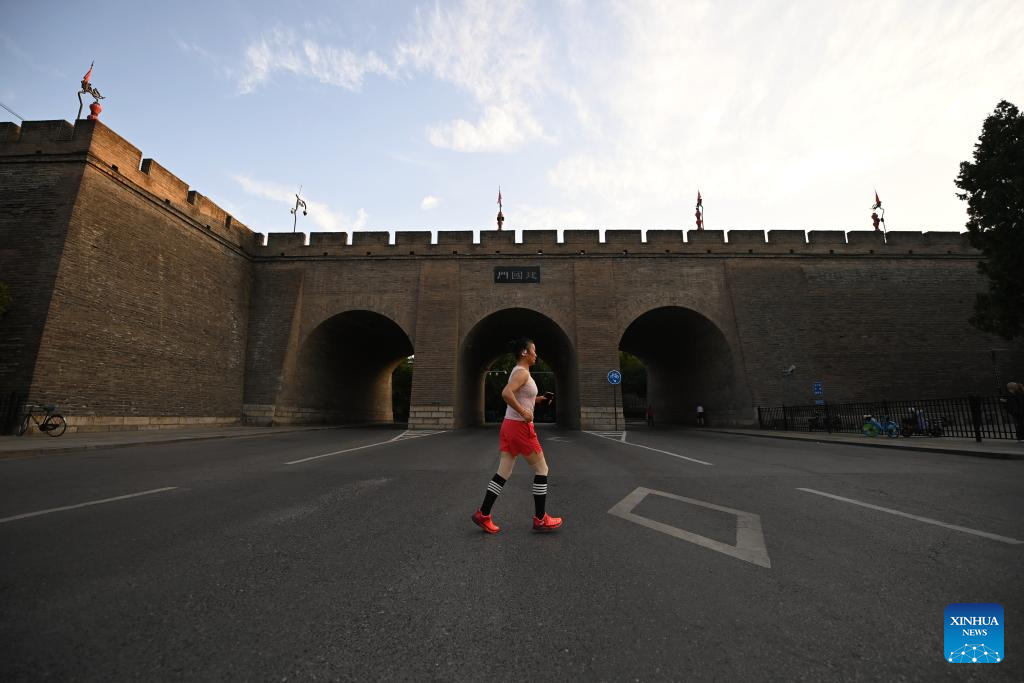 Photo taken on June 17, 2024 shows a resident jogging near ancient city wall in Xi'an, northwest China's Shaanxi Province. Xi'an, a city with over 3,100 years of history, served as the capital for 13 dynasties in Chinese history. It is also home to the world-renowned Terracotta warriors created in the Qin Dynasty (221-207 BC).