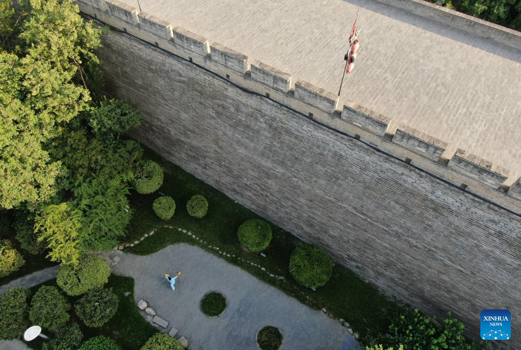 An aerial drone photo taken on June 12, 2024 shows a resident practicing Wushu near ancient city wall in Xi'an, northwest China's Shaanxi Province. Xi'an, a city with over 3,100 years of history, served as the capital for 13 dynasties in Chinese history. It is also home to the world-renowned Terracotta warriors created in the Qin Dynasty (221-207 BC).