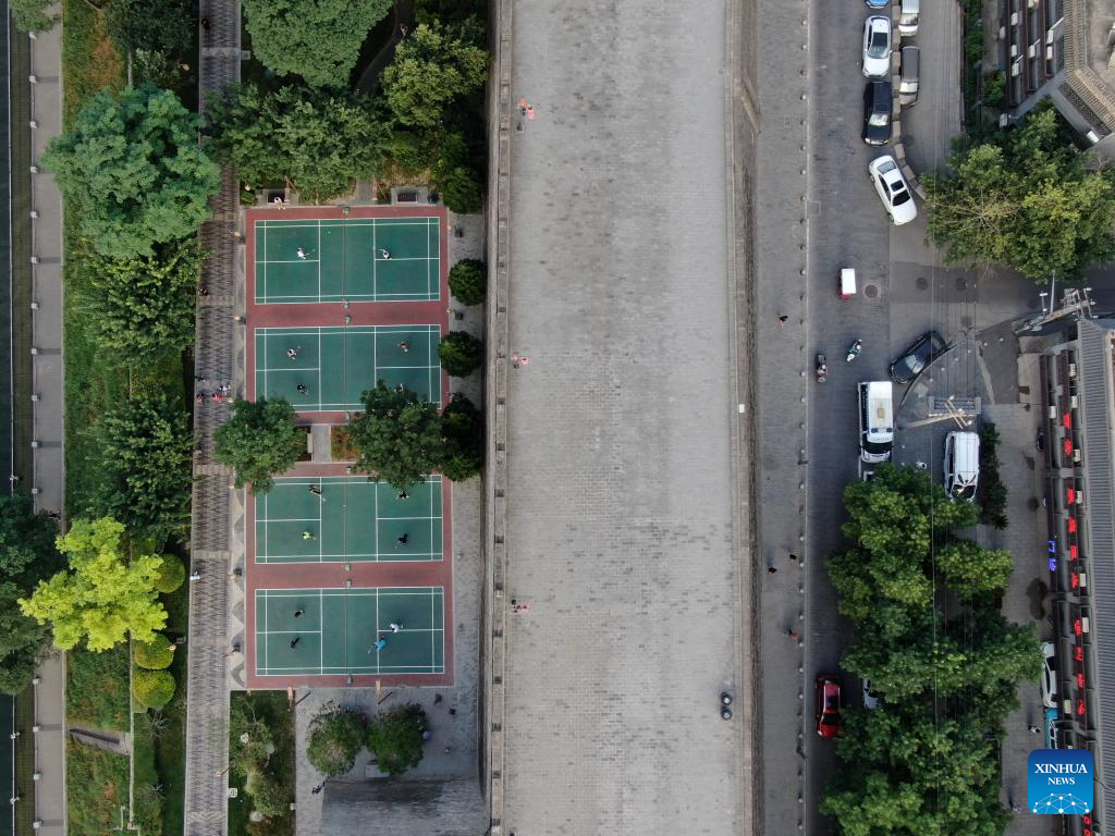 An aerial drone photo taken on June 14, 2024 shows residents playing badminton near ancient city wall in Xi'an, northwest China's Shaanxi Province. Xi'an, a city with over 3,100 years of history, served as the capital for 13 dynasties in Chinese history. It is also home to the world-renowned Terracotta warriors created in the Qin Dynasty (221-207 BC).